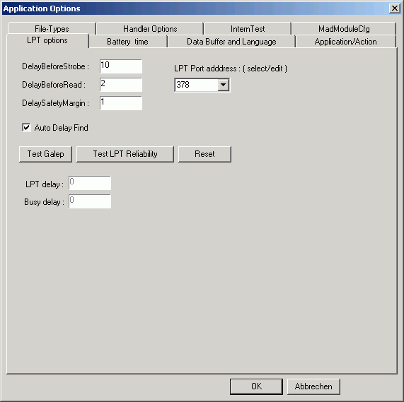 Click this checkbox to activate/deactivate this function. In activated state ( standard ) the Galep 32 software determine on Start automatic the values for DelayBeforeStrobe, DelayBeforeRead and DelaySafetyMargin for as fast as possible, but safe operating mode. In deactivated state the software use shown values, that can be optimized manually. After changing these values you should always to execute the Test Galep and Test LPT Reliability.
