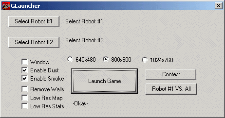 To enter your robots into an arena match simply launch the "GArena Launcher" (GAL) and select the two robot AIs from the pre-built AI folder (or a folder of your choice). Once the AIs are selected, press "Launch Game" and the program takes care of the rest.
