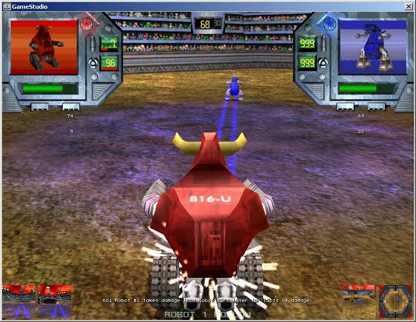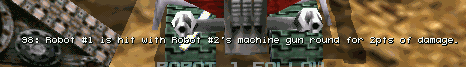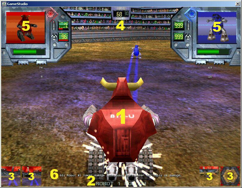 By pressing the ‘3’ or ‘4’ keys you will receive the "follow robot" view for robot #1 (3) or #2 (4). These views places you in a camera pod that is programmed to float behind the robot. It combines the excitement of the "in robot" view while allowing you a better sense of what is going on around the robot.