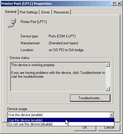 Right-click the deactivated LPT Port name and click Properties. On the Genaral tab, from the combobox Device usage select the Use this device (enable) item and close the dialog with OK button.