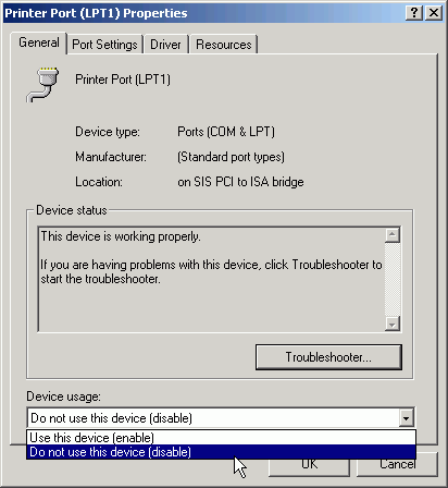 Right-click the LPT Port name and click Properties. On the Genaral tab, from the combobox Device usage select the Do not use this device (disable) item and close the dialog with OK button.