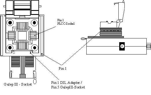 Please follow the diagram below to connect the adapter onto the GALEP in the right orientation, and to correctly place the programmable device into the adapter.