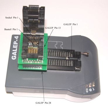 be used with most other programmers. Please follow the pictures below to connect the adapter onto the GALEP in the right orientation, and to correctly place the programmable device into the adapter. Devices with less than 16 pins can be placed into the adapter just as the DIL packages on the GALEP socket, but it’s a litlle difficult to keep the exact position of the device. |