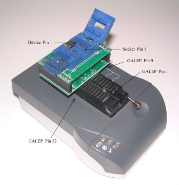 be used with most other programmers. Please follow the pictures below to connect the adapter onto the GALEP in the right orientation, and to correctly place the programmable device into the adapter. Devices with less than 24 pins can be placed into the adapter just as the DIL packages on the GALEP socket, for devices with less than 12 pins it’s a litlle difficult to keep the exact position of the device. |