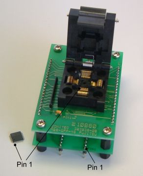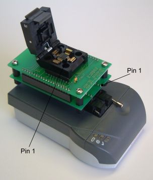DIL package to a 48-pin QFP package (for MCU MB90Fxxx from Fujitsu). Please follow the diagram below to connect the adapter onto the GALEP in the right orientation, and to correctly place the programmable device into the adapter. |