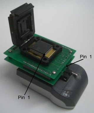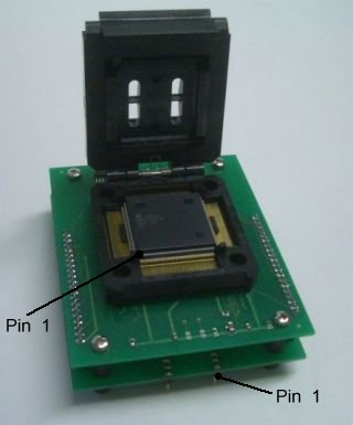 Adapter for converting from a 40-pin DIL package to a 208-pin QFP package for MCU MB91F467D from Fujitsu. Please follow the diagram below to connect the adapter onto the GALEP in the right orientation, and to correctly place the programmable device into the adapter. |