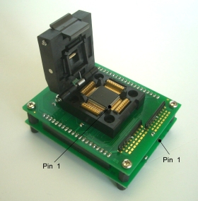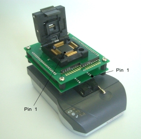 Adapter for converting from a 40-pin DIL package to a 100-pin QFP package (for MCU MB96Fxxx from Fujitsu). Please follow the diagram below to connect the adapter onto the GALEP in the right orientation, and to correctly place the programmable device into the adapter. |