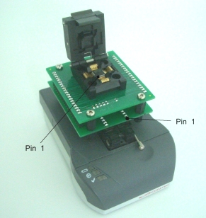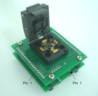 Adapter for converting from a 40-pin DIL package to a 48-pin QFP package (for MCU MB90Fxxx from Fujitsu). Please follow the diagram below to connect the adapter onto the GALEP in the right orientation, and to correctly place the programmable device into the adapter. |