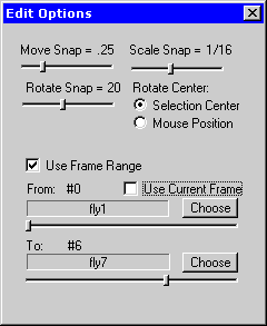 Die Move Snap, Rotate Snap und Scale Snap Werte geben die Schrittweite für das Verschieben, Drehen oder Skalieren per Maus oder mit den Cursortasten vor. Mit Rotate Center kann der Drehpunkt für Rotationen bestimmt werden, zur Auswahl stehen der Mittelpunkt der Selektion, die Mausposition, und der Nullpunkt des Modells. Wenn das Use Frame range Kästchen