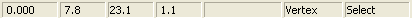 Zeigt die Cursor-Position, die Nummer des selektierten Vertex oder Dreiecks, und den augenblicklichen Modus. Die Vertex-Nummer kann in C-Skripten zum Anfügen eines Effekts oder Lichts an bestimmte Stellen des Modells benutzt werden, oder zum Zusammenfügen mehrerer Modelle. Außerdem wird noch der Bonesdrehmodus angezeigt!