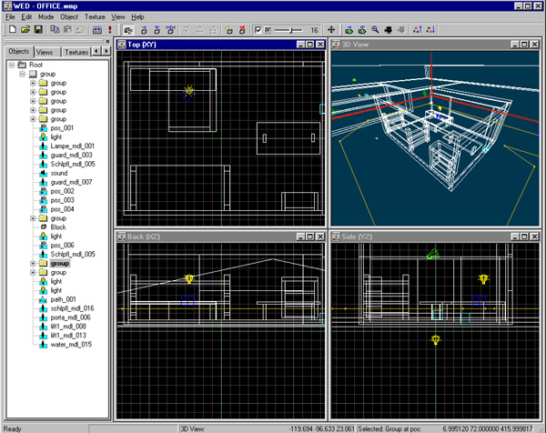 Das erste, was einem Neuanwender auffällt, sind die vier 2D und 3D Fenster. Jedes repräsentiert einen unterschiedlichen Blickwinkel in das Spiel-Level (Top - von oben / Back - von hinten / Side - von der Seite). Sie können den Blickwinkel verschieben, indem Sie rechts in ein Fenster klicken und ziehen, und Sie können mit dem Mausrad in jedem 2D-Fenster zoomen.