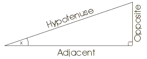 Die grundlegenden Funktionen verwenden für die Berechnungen die Längen der Hypothenuse (die längste Seite), der Gegenkathede (Opposite), die dem Winkel x gegenübersteht, und die Ankathete (Adjacent), die am Winkel x anliegt. Der Sinus von x, geschrieben sin(x), ist definiert als: