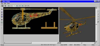 Der Skin-Editor wird über File / Skin Editor aus dem Hauptfenster geöffnet. Bevor Sie Skins zur Darstellung auf dem Modell malen oder importieren können, müssen Sie ein Skin-Mapping erstellen. Dieses definiert welche Bereiche der Skin auf welche Bereiche des Modells aufgebracht (`gemappt´) werden. Im linken 2D-Fenster können Sie das Mapping editieren oder direkt auf das Modell malen. Das rechte Fenster dient zur 3D-Darstellung der ausgewählten Mesh-Gruppe des Modells. Sie können sie mit der linken Maustaste in alle Richtungen rotieren und mit der rechten Maustaste zoomen.