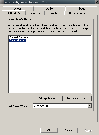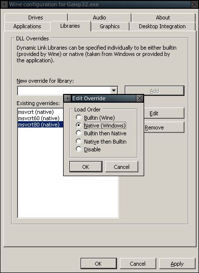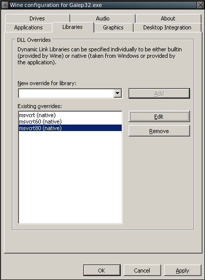 Make sure to leave the "Galep32.exe" entry selected in the ListBox and switch over to the Libraries tab. Add three overrides for the following DLLs